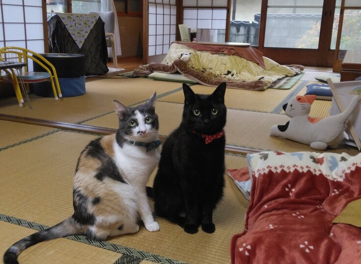 看板猫のそら(黒猫)とまめ(三毛猫)