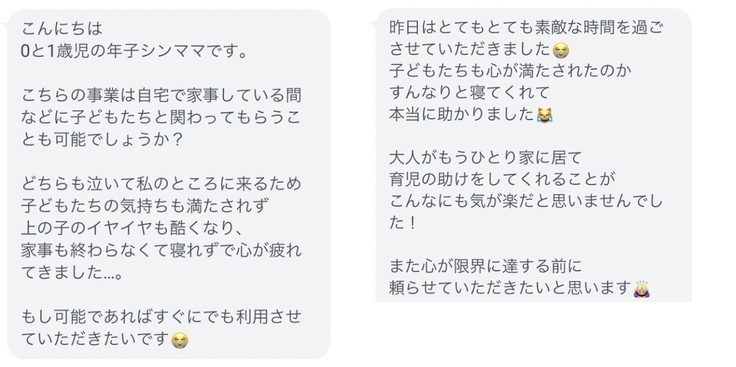 リピーターのなかには、仕事と家事、育児に行き詰まる1歳と0歳のシングルマザーがいます。以下は、初回ご利用時のお問い合わせとご感想です。
