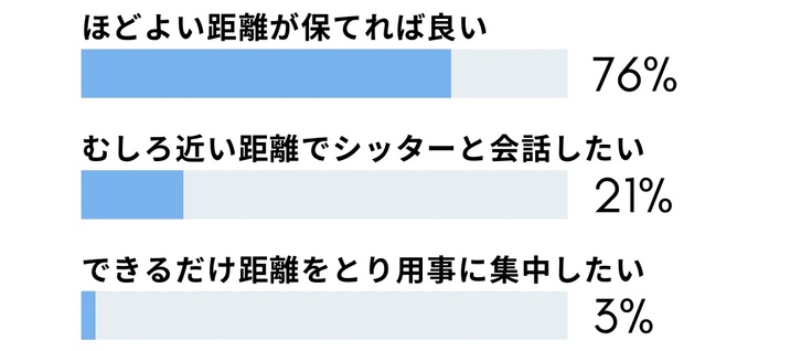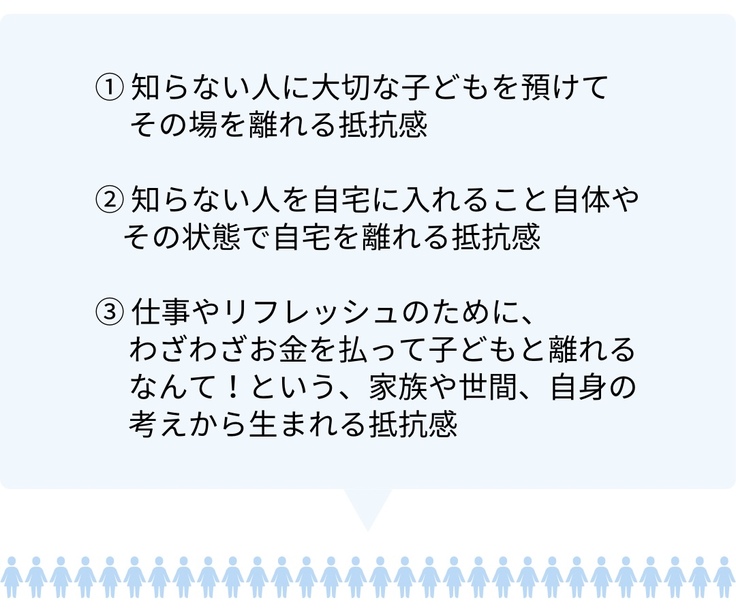 ①③に共通するのは「子どもと離れる抵抗感」です。また、②のように、ベビーシッターといえば"自宅"で、というイメージが強いですが、共働き世帯やシングルマザーが増加するなか、ベビーシッター=自宅以外でも頼れる存在というイメージがあってもいいように思います。