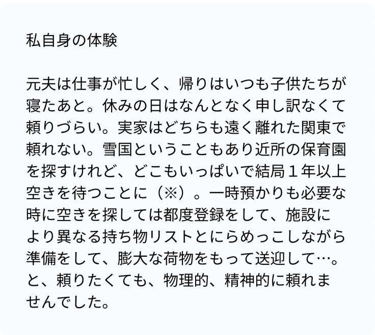 いやいや、そもそも家族や保育施設を頼ればいいのでは?という声もいただきます。