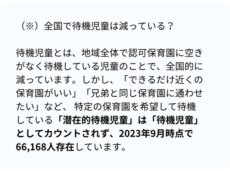 また、全国的に待機児童は減っているとのことですが、隠れ待機児童(潜在的待機児童)問題(※)に頭を抱えるママは未だ6万人以上存在します。