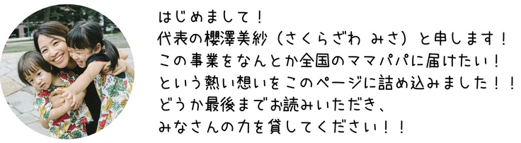 実は、私は長女ということもあり?人を頼ることが少し苦手です。この取り組みに共感し、多くの人が手を差し伸べてくれていますが、頼り方が分からず、気付けば、「ありがとう!大丈夫!」と私一人で抱え込んでしまいます。とはいえ、当サービスを全国のママパパにお届けするには、多くの人を頼る必要があることは明確です。このクラウドファンディングを通してみなさんを頼り、ご支援とご声援を受け取る器も広げられたらと思っています!!
