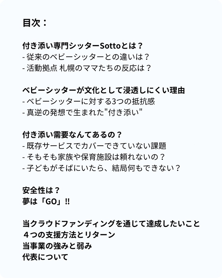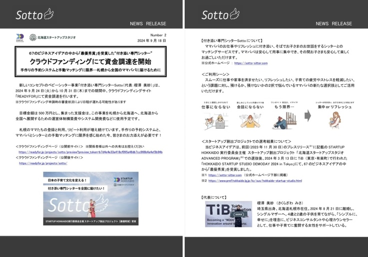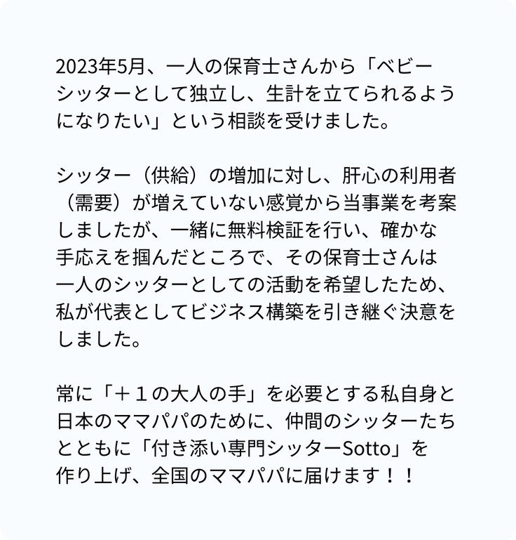 日本の文化と時代に合った新しいコンセプトのベビーシッターマッチングサービス「付き添い専門シッター Sotto」を全国のママパパに届け、日本の子育て文化を変えたい!!