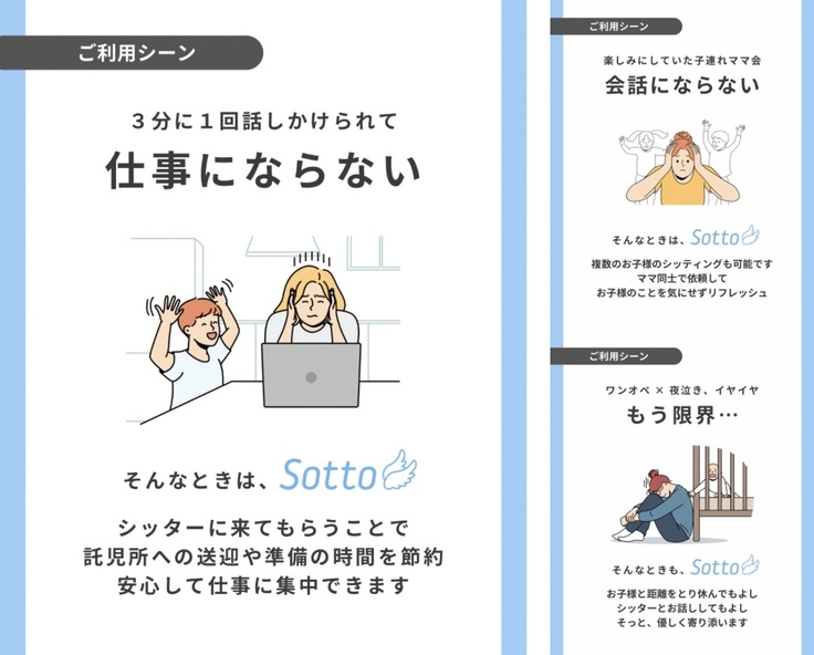 それであれば、どこでも利用できる、子どもと離れない前提のサービスで抵抗をなくしていけないだろうか。ということで、生まれたのが「付き添い専門シッターSotto」です。
