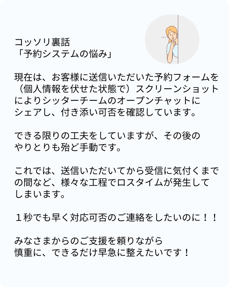 その後、私が「本当にやるのか、やらないのか」という葛藤により、思うように宣伝できなかった半年間も、問い合わせや利用が止まず、利用は70件、リピート利用は25件に増えました。