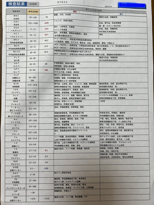 TP(総蛋白)はアルブミン+グロブリン=総蛋白という計算だそうで、数字が基準値からオーバーしていますが、栄養が摂れてるという評価でいいとのお話しでした。上の方の赤い数字の部分は日内変動もあるようで、様子見で大丈夫な範囲だそうです。