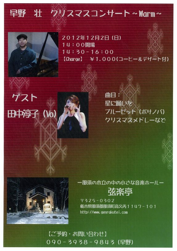 上の写真は2012年の冬に行ったクリスマスコンサートの目次です。不定期ながらこのような小規模コンサートを開催して頂いているのですが、今回、普段から私の音楽活動を応援して頂いている知人の皆様にオリジナル曲を聴いて頂きたいということでプロジェクトの実施を決意しました。