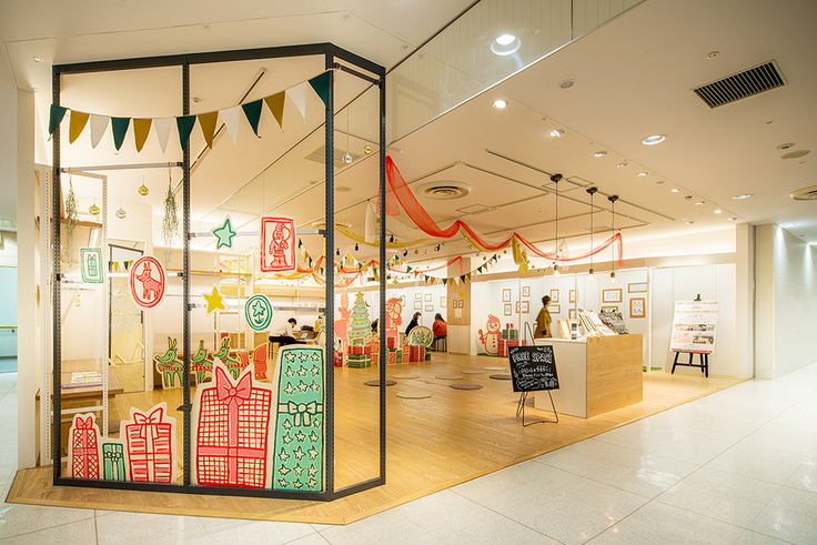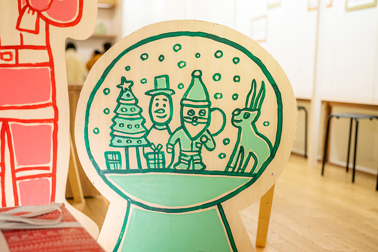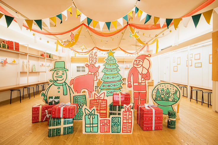 板に手描きしたサンタクロースやツリーたちのほか、菅光輝くんの原画も拡大印刷して展示したり、プレゼントBOXも量産して楽しい空間を目指しました。