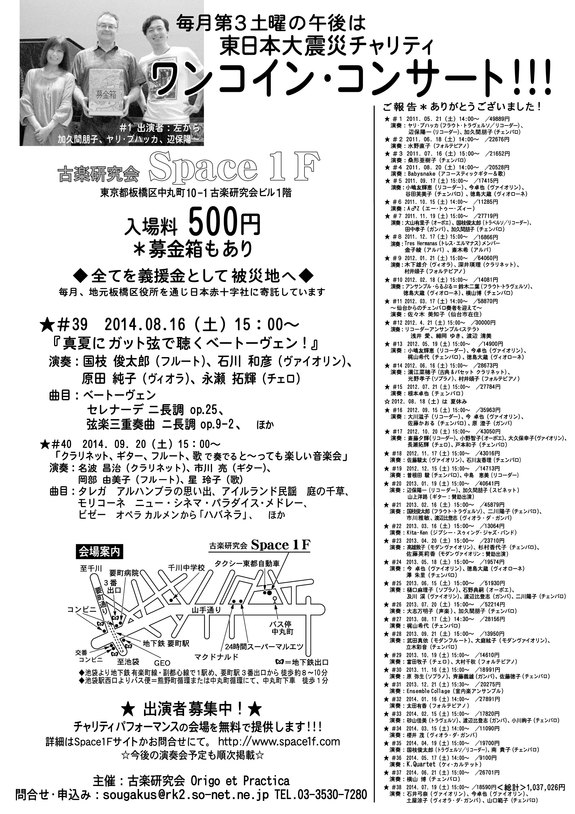 来週土曜は第3土曜日、東日本大震災チャリティコンサートの第39回開催です。