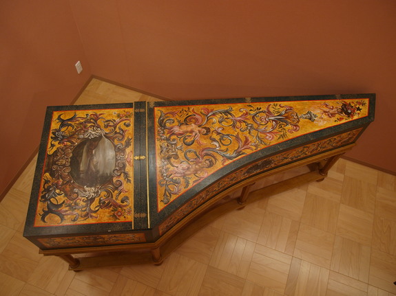 冒頭の写真では表側をご覧いただきましたが、内側には、オランダ17世紀の風景画でよく取り上げられ、フレミッシュのチェンバロにもしばしば描かれた画題である「サンタンジェロ城(ローマのCastel Sant.Angelo)の襲撃」が、ふたの形に合わせ、左右逆にして描かれています。これは実物でご覧いただいたほうがわかる…と思います。できれば是非、今週土曜日の東日本チャリティ ワンコイン・コンサートで!