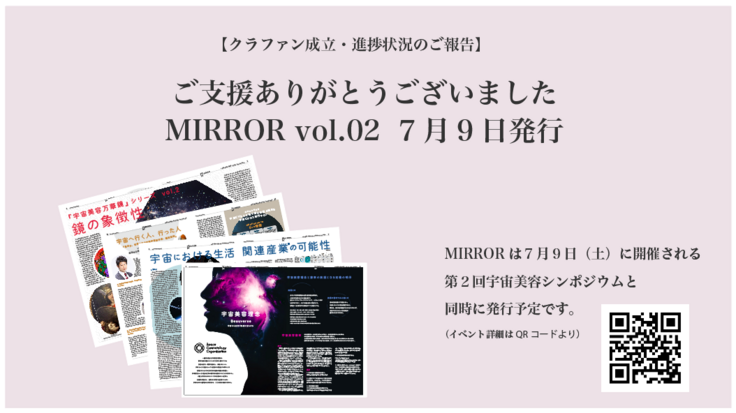 またこの度、MIRROR Vol.02の制作が完了し、7月9日に発行いたしますことをご報告させていただきます。 後日、ご購入いただきましたリターン商品と共に、発送させていただきます。