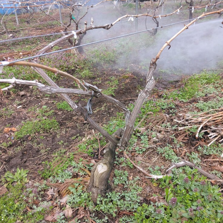 ぶどうの樹齢を重ねると樹皮が一部剥がれやすくなり、その隙間に虫が卵を産んだり隠れて越冬したり、病原菌がついたりします。古くなった樹皮(粗皮)を除去しますが、手作業ではとても手間と時間がかかります。当園では高圧洗浄機に専用のノズルを付けて、水圧で粗皮剥ぎ作業を行っています。