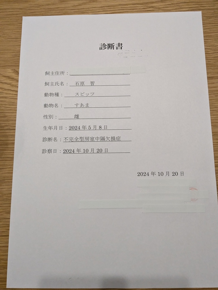 先生からは、手術には心臓を一旦止めて、壁を生成する術式を行うことから“人工心肺”を使うため、手術後も心臓が動き出す補償が無いことや、麻酔が覚めないこと、血栓ができ様々な症状が出てしまう恐れがあることなど親切丁寧に説明を受け、最短での日程である令和7年1月10日に手術を依頼しました。