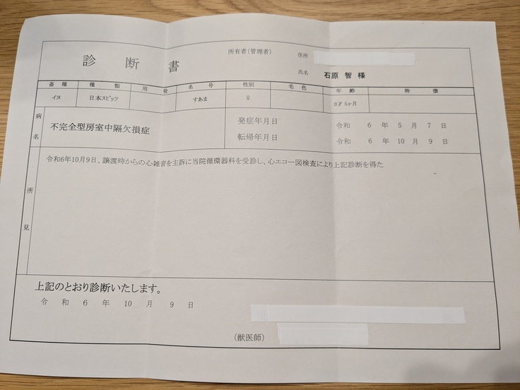 “心雑音”については、「子犬特有のもので大人になると無くなる可能性がありますよ。」との話を受け、期待を込め迎え入れましたが、2回目のワクチン接種を行うため、9月下旬にかかりつけの動物病院で検診を実施。