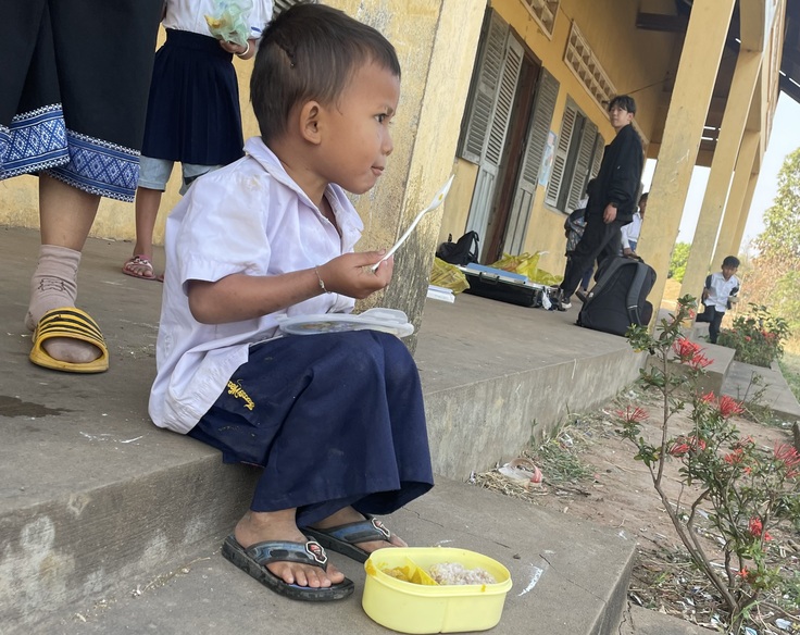 私たちが訪れた小学校では、毎日朝10時に子どもたちがお皿とスプーンを持って学校に来て、配給されたご飯を食べている様子が見られました。また、小学校の校庭に小屋のようなものあり、そこで日本円で10円~20円でお皿1杯分のご飯やパンが大人達によって販売されており、お金を握りしめた子どもたちが小屋に集まり、校庭や教室で食べている様子も見られました。勉強をする以前に毎日ご飯を食べることすらギリギリの状況が、カンボジアの子どもたちにはあるのです。