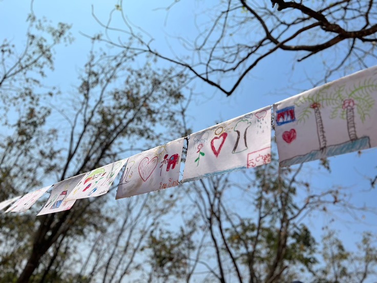 画用紙は全て日本から持ってきたものでクレヨンは日本で皆さんに寄付して頂いたものを全て持っていきました。子どもたちが積極的に楽しみながら活動してくれたので、たくさんの素敵な絵が完成し、運動会当日には素敵な万国旗を飾ることが出来ました。