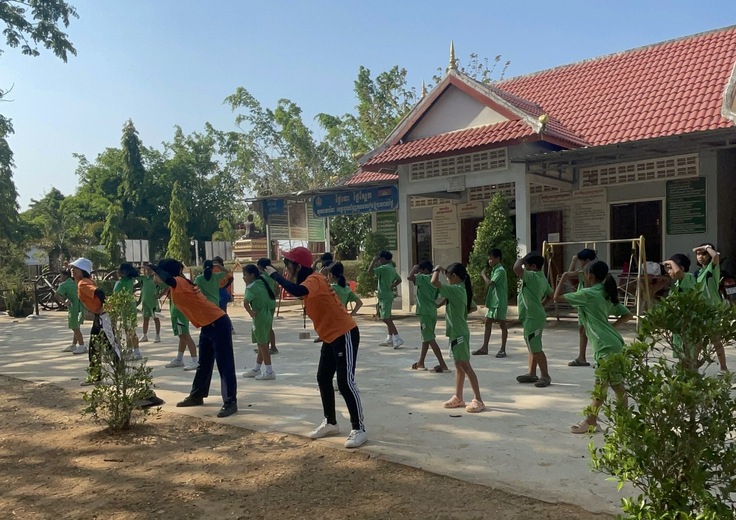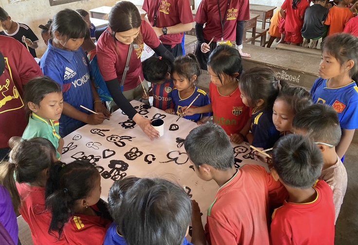 私たちSPLEAは、国内で出来る支援だけでなくカンボジアに渡航し、直接子どもたちに教育支援をするという活動を行っています。今年の2月には4つの小学校をまわり、音楽、図工、伝承遊び、体育(運動会競技、バレー、サッカー、ダンス)、英語の授業を行いました。カンボジアに渡航するまでに各グループで話し合いを重ね、何度も指導案を練り直した上で授業に臨みました。ここからは実際の現地での写真を提示しながら、説明して行きたいと思います。