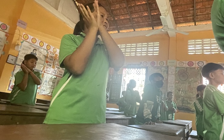 日本では1人に1台机と椅子がありますが、カンボジアでは、1つの長机と長椅子に3人~4人が