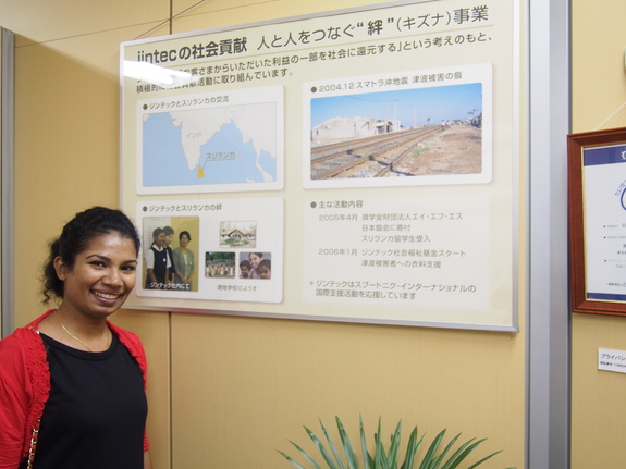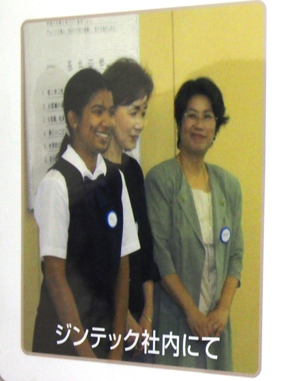東京都千代田区の本社に伺うと、ご担当のT様が迎えて下さいました。受付には2006年1月に正式に設立された「ジンテック福祉基金」の紹介パネルが掛けられており、前回8年前の訪問時のテジャニの写真が。歴代の後輩留学生達から話を聞いていても、テジャニ本人はこのパネルの自分の写真と初めての対面です。