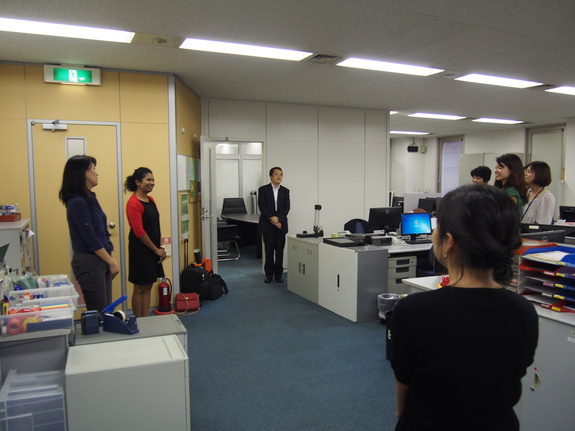 (社員の皆様にご挨拶するテジャニ。隣はAFS日本協会の大野さん)
