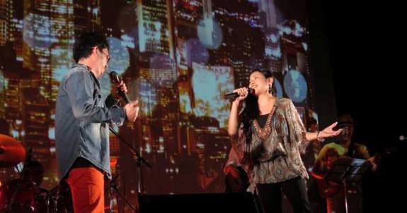 ゲストボーカルとして登場頂いたステージ。XQ'sのボーカル、南さんと一緒に。