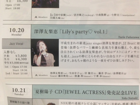 現在は月10本以上のペースでライブ活動をされていますが、スプートニクの岡・青木がうかがったのは、今週20日に渋谷のJZ Brat SOUND OF TOKYOで行われた「Lily’s party♡ vol.1」。