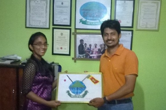 ハンサニが、お礼の記念品として、SPUTNIK International Sri Lankaのロゴを、刺繍で作って来てくれました。キッツリ理事長に贈呈式!