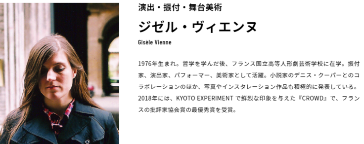 2010年、第一回目のKYOTO EXPERIMENTに登場し観客に衝撃を与えたジゼル・ヴィエンヌは、2018年のフェスティバルでも『CROWD』を発表し、その異才ぶりを強烈に印象付けました。KYOTO EXPERIMENTでの2回の上演や、そのほか京都でのヴィエンヌの長きにわたる活動がロームシアター京都での『ショールームダミーズ#4』創作と発表に結実したことは、日本のみならずヨーロッパの舞台芸術シーンにおいても画期的なことといえます。国際的なコラボレーションに困難が伴ういまだからこそ、この作品がヨーロッパの観客に提示されることを切に願います。