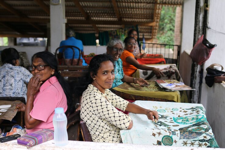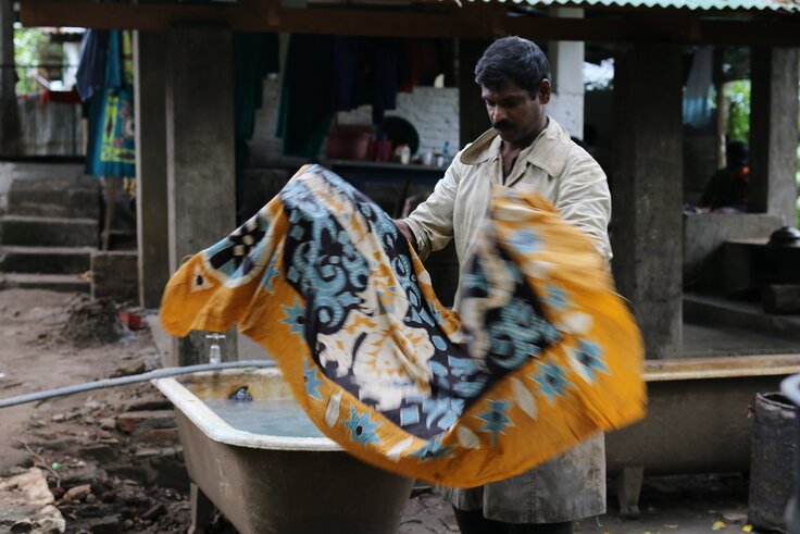エナ・デ・シルバは1961年にコロンボの自宅スタジオにてテキスタイルやバティックのデザインを開始。その後、スリランカ国内に複数の工房を設立し、地域の女性たちとともにバティックや刺繍をはじめとした伝統工芸の復興に取り組みます。