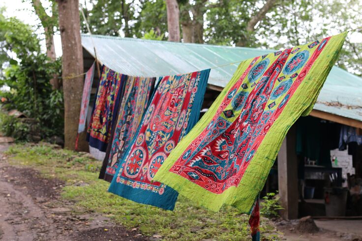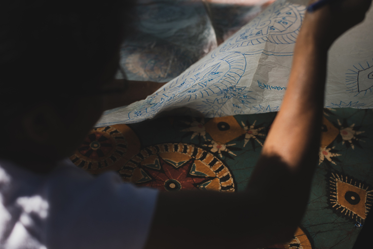 バティックは、布に筆で蝋を塗り、染料が入ることを防ぐことで絵柄を表現します。2色、3色、4色と、色合いを出すためには、布に蝋を塗り染色したら、蝋を落としてさらに新しく蝋を塗り、また染色する作業を繰り替えさなければいけません。大きな作品になれば、その作業はさらに大変なものになります。