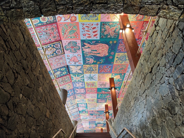 目を凝らしてみてみると、さまざまな地元の動植物が描かれており、一部はイギリス植民地統治時代に使われていた地域の旗に由来するものもあり、50以上の組み合わせがあると言われています。これは地元の文化を紹介し、スリランカのアーティストとコラボレーションするというバワのビジョンを表現していて、エナとバワのコラボレーションとしては最大級の作品です。