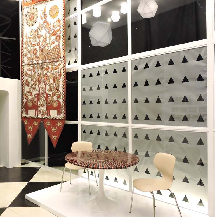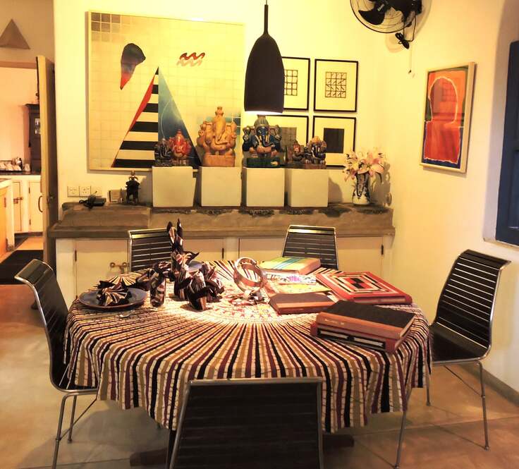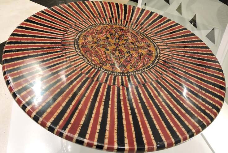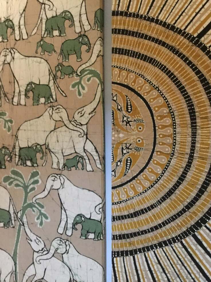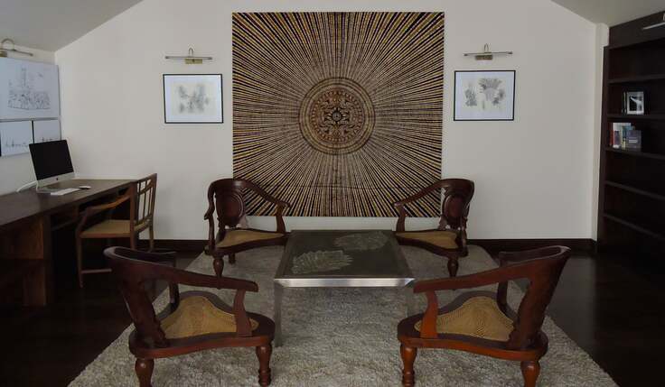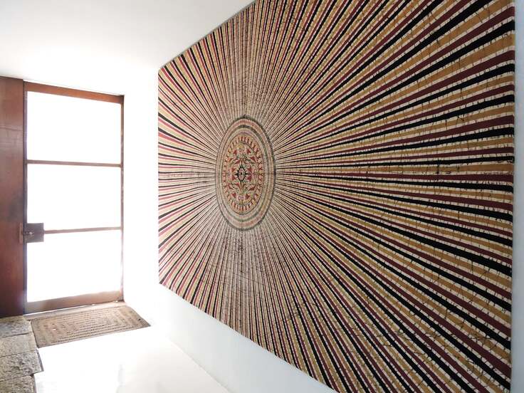 2022年のエナ・デ・シルバ生誕100周年記念イベントの一つとして、エナの友人であった建築家のC.アンジャレンドラン(Chelvadurai Anjalendran)の私邸にて、アンジャレンドラン氏が自ら案内しながらエナやアルウィハーレ・ヘリテージ・センターの作品やコレクションを紹介するプログラムがありました。その際に、丸テーブルにテーブルクロスとして掛けられていたのも、サンバーストのバティックでした。