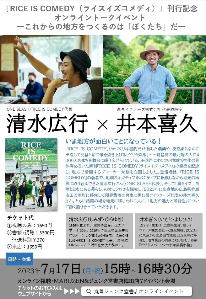 7月17日(月・祝)、大阪のMALZEN&ジュンク堂書店梅田店にて『RICE IS COMEDY』著者の清水広行さん×農ライファーズ代表の井本喜久さんによる「地方の魅力と可能性」を語り尽くすトークイベントを開催することになりました。