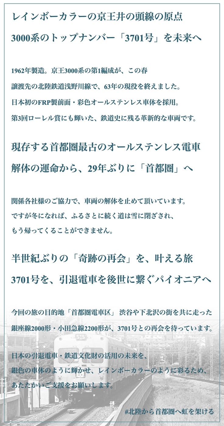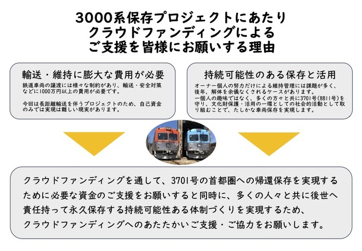 街が変わり、技術が進歩しても、本物が持つ説得力や存在感は決して色あせません。バーチャルやAIといった技術進歩が注目される令和の時代だからこそ、「本物を残すこと」を追い求めたい。我が国のオールステンレス車両のパイオニアである3701号を、首都圏の地で未来へと引き継ぐため、皆様のお力をお貸しいただけないでしょうか。