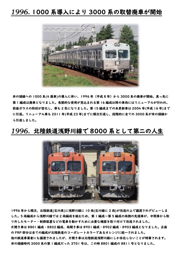 東京の発展と共にした後、29年間北陸鉄道浅野川線で朝夕に黄色い帽子を被った小学生達を乗せ続けたオレンジ帽子の浅電くん。1996年末に小学校1年生だった子ども達も40歳です。浅電利用者と共に恩返しのつもりで、これからも東京と金沢・内灘を繋ぐ末永いレインボーになりますよう、本支援活動にご理解ご協力をお願い申し上げますと共に、北陸鉄道様、京王電鉄様ならびに関係各位に対しましても、保存活動有志の微末より深く感謝する次第です。