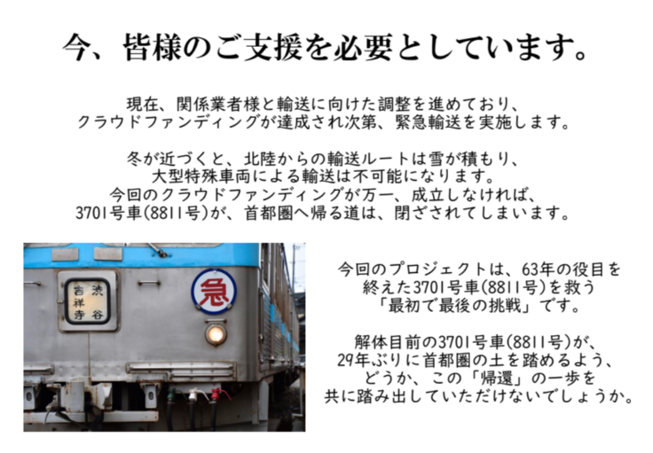 お預かりしたご支援は全額返金となり、3701号車(8811号)は解体されてしまいます。