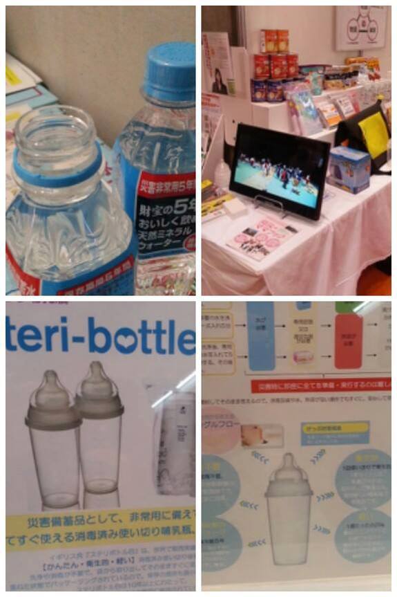 この前の防災ママサロンで、「哺乳瓶やミルクはどうする?」って話が出たと思うんですが、隣の隣のブースが使い捨て哺乳瓶のブースで、洗浄・消毒済みの哺乳瓶で未開封であれば5年間無菌で備蓄出来る哺乳瓶がありました!!