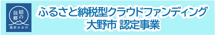 本プロジェクトは大野市が「ふるさと納税型クラウドファンディング」の対象事業として認定しています。寄附の方法は通常のクラウドファンディングと同じですが、実質負担2千円で寄附できるメリットがあります。※確定申告が不要なワンストップ特例制度の申請をご希望の方は、ページ下部に留意事項を記載しておりますので、必ずご確認ください。