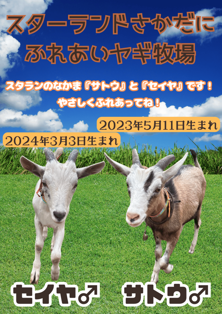 「スターランドさかだに」の敷地内では2頭のヤギを飼育しています! 2頭は兄弟で、小柄で人懐っこく、おとなしい性格なので、安心して触れ合うことができます。
