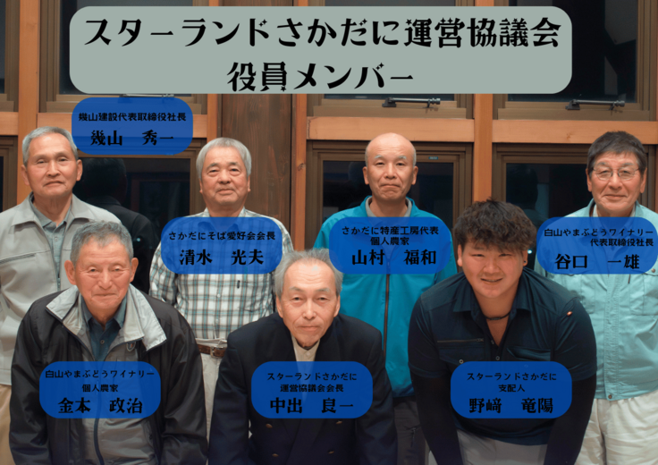 協議会は学校の校長経験者で、阪谷をよくする会会長も務めている中出良一会長を筆頭に、さかだにそば愛好会会長、さかだに特産工房代表の個人農家、阪谷地区にあるワイナリーの代表、地域の建設会社の代表、元県庁職員などがおり、経営者、教育者、生産者などの様々な分野に特化したメンバーで構成されています。