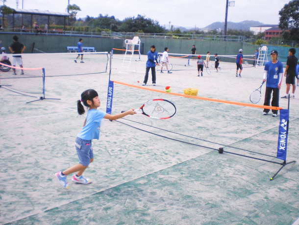 はじめまして。島根県テニス協会事務局の芦山です。協会では県内にテニス競技の普及を目的とした事業を数多く展開しています。play&stayプログラムを活用したオープン型イベント(テニスフェスタ、ストリートテニスなど)や、クローズ型イベント(小学校こども広場ミニテニス活動、特別支援学級の交流活動、幼稚園・保育所キャラバンなど)多くのこども達がテニスに触れ楽しんでいます。