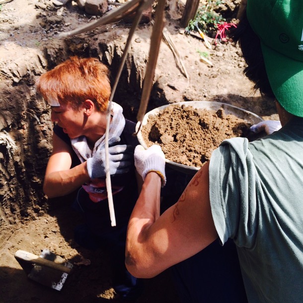 現地での作業の一つで、穴を掘っている写真です。声を掛け合いながら、一生懸命掘ります!