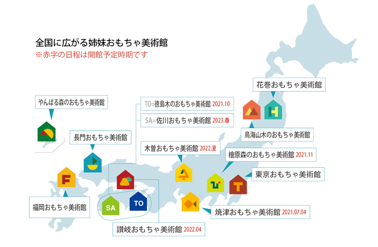 2014年の沖縄県国頭村のやんばる森のおもちゃ美術館の開館をきっかけに、おもちゃ美術館の仲間は全国に広がり続けています。