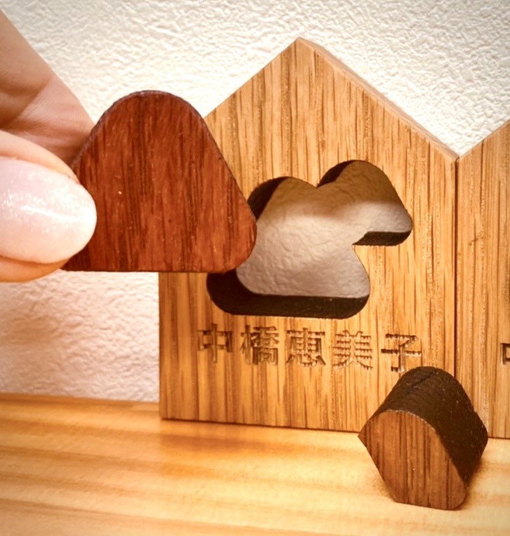 一口館長の証として、おもちゃ美術館内に、ロゴマークをかたどった積み木に支援者様のお名前を刻印したものを展示します。そして、一口館長の皆様のお手元には、讃岐らしいおむすび型の山の形をした、積み木のパーツをお届けします。美術館がオープンしたら、ぜひこの「おむすびつみき」を持ってご来館ください。ご自身の三角屋根積み木に「おむすびつみき」を置いていただき、おむすび型の山々が並ぶ、讃岐の風景を一緒に完成させましょう!