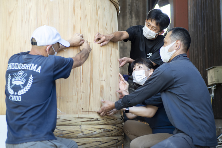 創業約160年の小豆島ヤマロク醤油5代目山本社長と桶職人、そして岡木工所岡さんらがつくれられて立派な吉野杉と小豆島の竹を割いて作られた箍(たが)で組まれた直径約2メートルもある木桶。