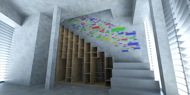(4)2階に上がる階段の下は本棚とし、子供向けの読書プログラム用の本を常設