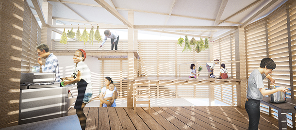聞き取りと現状を踏まえ、子どもたちの遊び場・集会場所として使えるコミュニティスペース、大人数で使える大きなキッチンを持った2階建てのコミュニティキッチンを設計することになりました。