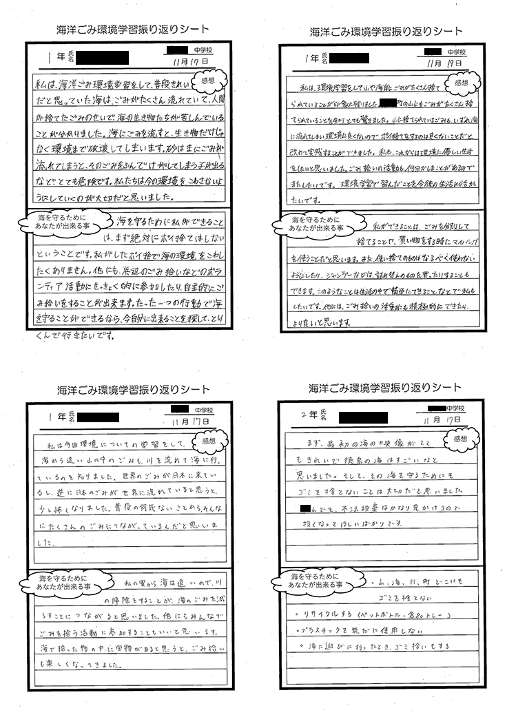 この学習用動画は実際に45分授業で使用し完結できることから、先生方に好評であり、さらに地球写真家石井友規自らがこの教材を使用した出前授業後においても、子どもたちからの振り返りシートより手応えを得ておりました。海洋プラスチックごみは化学繊維や人工芝、肥料カプセルなど普通の生活の中からも日々生まれていること、発生を食い止めるために世界中が新しい技術を開発していること、回収した海岸漂着ごみを使ったビーチアートづくりなど、新しい気づきや可能性についてたくさんのことを発見し学び得ている様子が目に見えました。