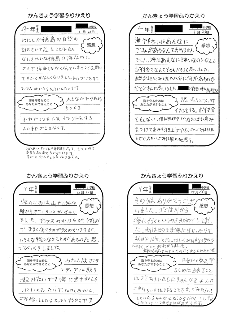 (「徳島の海を守れ大作戦」を使った授業の振り返りシートの一部を紹介)