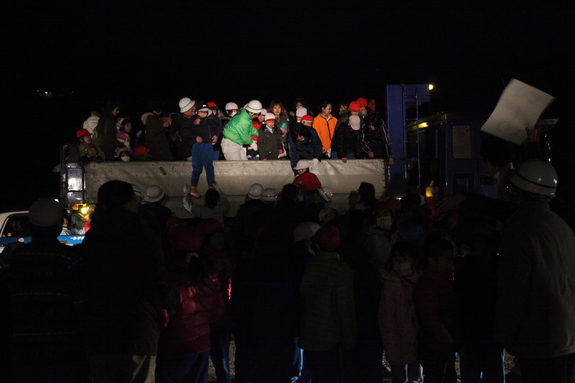 ▼震災当日夜ダンプで運ばれる多くの子供達